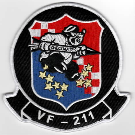 The “Flying Checkmates” of VF-211 fly the F-14A Tomcat from NAS Oceana, VA. They trace their roots to VB-74, established in May 1945, but acquired their current designation in March 1959. This is the “GRAY” bordered version of their squadron patch. They were TARPS capable and were based on the West-Coast ships. They were attached to CVW-9 aboard the USS Stennis (CVN-74).