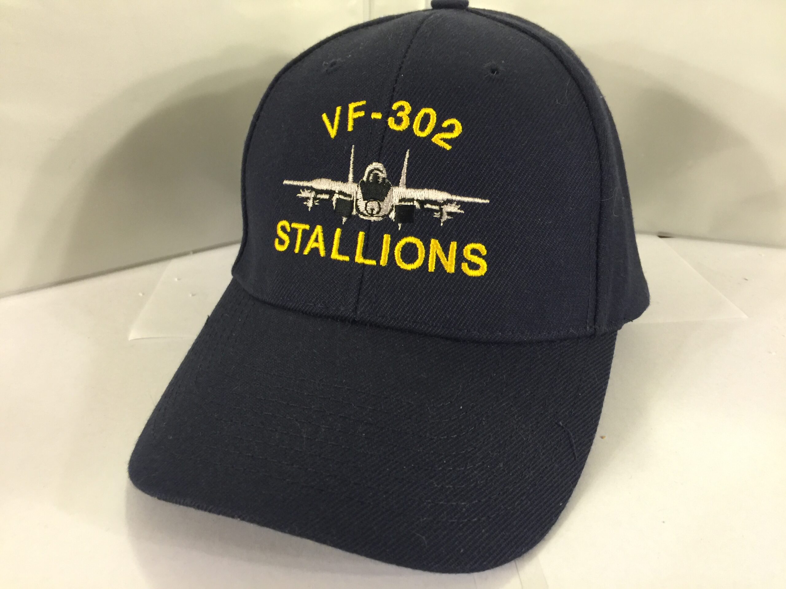 This is the navy wool version with the plastic adjustable strap in the back that has the VF-302 squadron name and frontal view of the F-14 Tomcat directly embroidered onto the front of the cap.