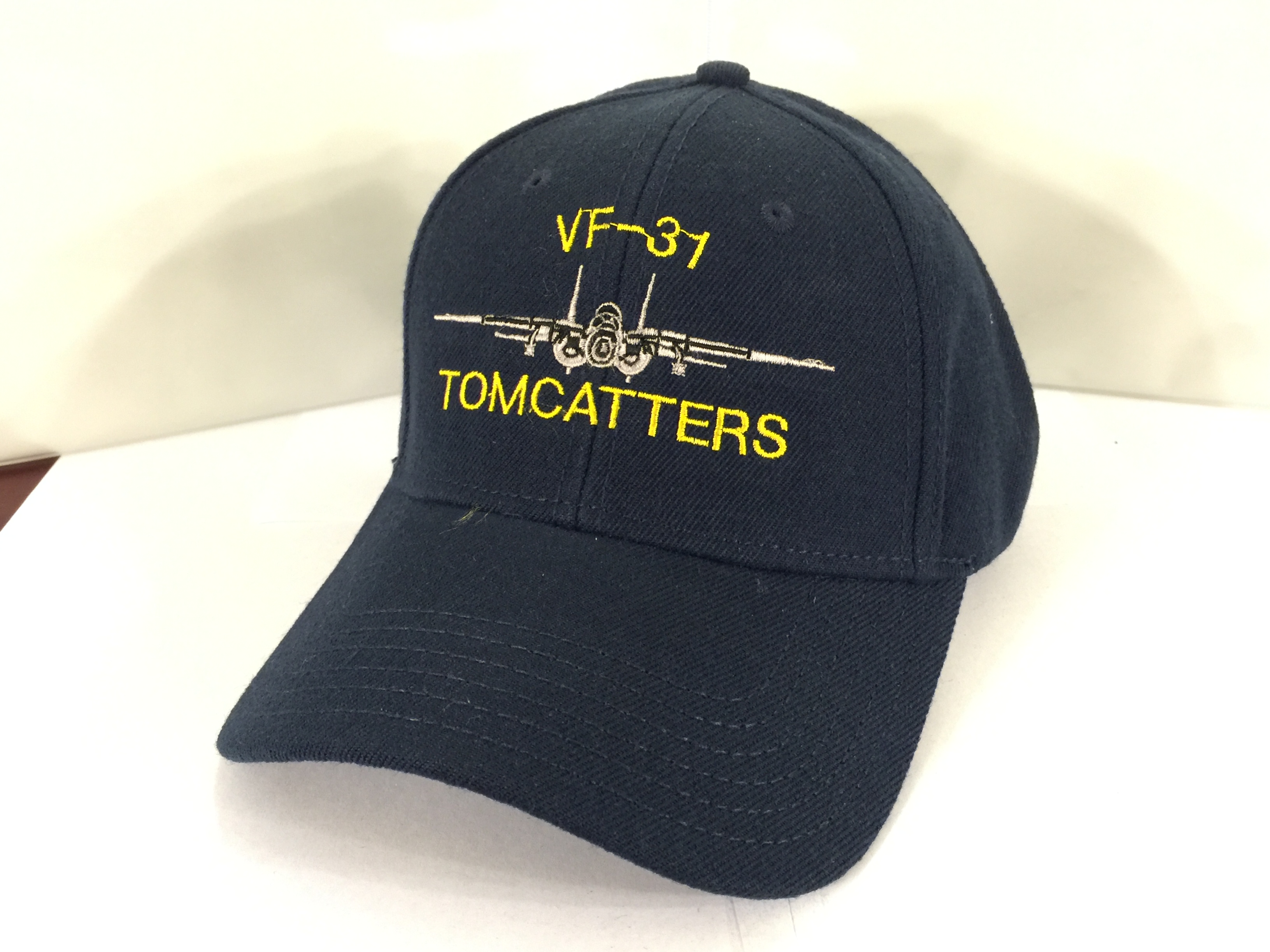 This is the navy wool version with the plastic adjustable strap in the back that has the VF-31 squadron name and frontal view of the F-14 Tomcat embroidered directly onto the front of the cap.