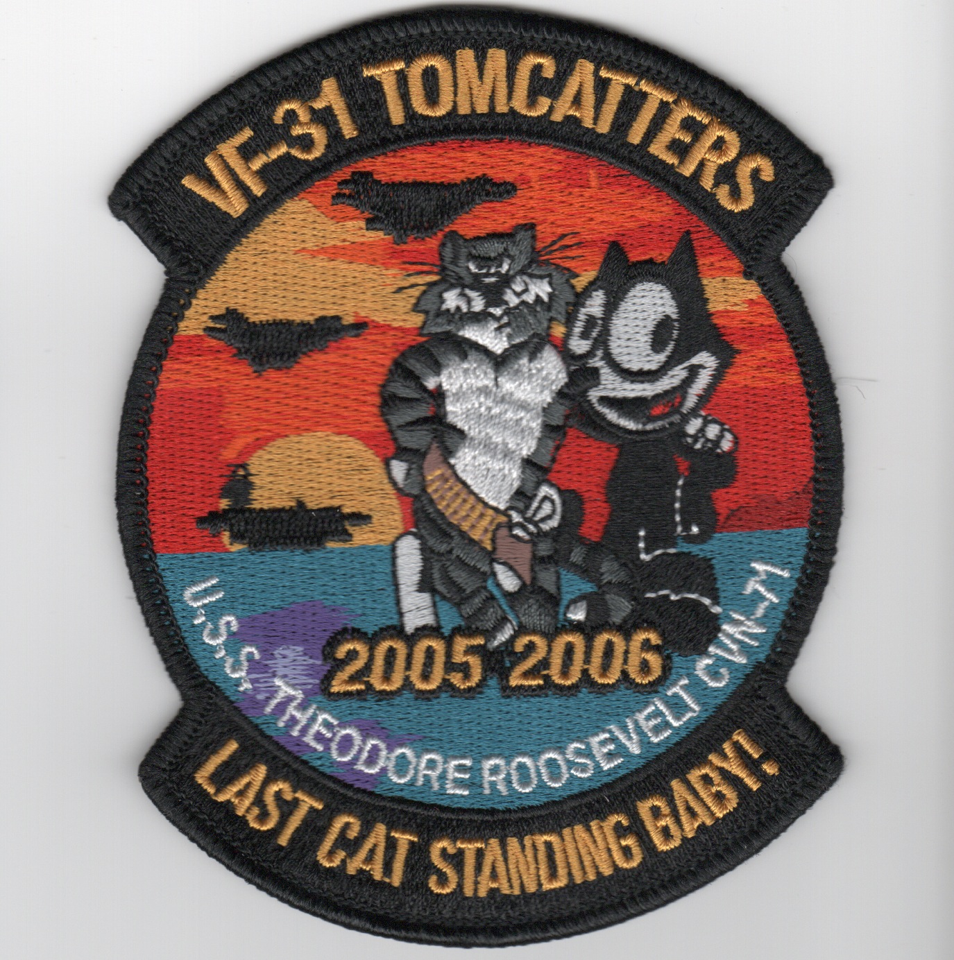 This is the “Last Cat Standing” cruise patch created for the VF-31 Tomcatters. It shows Felix leaning against their mascot and states “LAST CAT STANDING, BABY” along the bottom. This truly is a MUST HAVE for anyone that collects!! This patch does not have velcro attached.