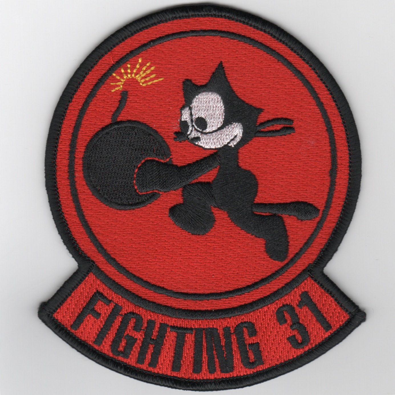 This is the red version of the current squadron patch for VF/VFA-31. The “Tomcatters” are the second oldest Navy fighter squadron dating back to VF-1B on July 1935. They flew the F-4J Phantoms until transitioning to the F-14D Tomcat in January 1992. They pioneered the use of the TARPS pod for reconnaissance missions and participated in the Lebanon and Syrian conflicts, the latter of which they were engaged by hostile AAA and missile fire.
