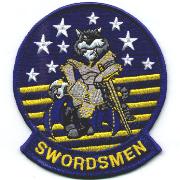 This is the Felix patch from the VF-32 Swordsmen. As shown, Felix is decked out in armor, leaning on a sword with the twin tails, blue cape, and helmet in right paw. They lay claim to being the last US Navy aircrew over Baghdad, overflying it at 4 March 91. This is the color version of the felix patch.