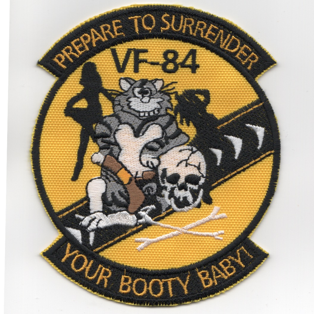 The original “Jolly Rogers” were from VF-84, but have an interesting squadron history. They were initally designated as VA-86 on 1 July 1955, but were redesignated to VF-84 on the same day! They were the second squadron to bear the VF-84 designation and bore the proud “Skulls and Crossbones” as their markings. They flew the F-4N Phantoms before transitioning to the F-14A Tomcat, but were decommissioned in the early ’90s. They were also the squadron used in the Seagal movie, “Executive Decision”, flying intercepts off the coast of Key West. This is the ‘PREPARE TO SURRENDER YOUR BOOTY, BABY’ patch I found in a small Karean sweat shop on my last visit over there and does not come with velcro attached.