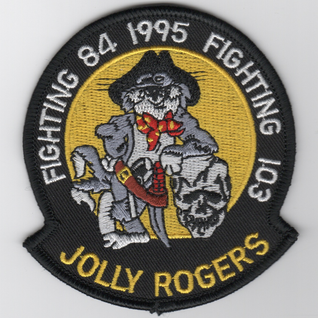 VF-84 was one of the oldest US Navy squadrons before decommissioning and transferring their name to VF-103. VF-103 was established in May 1952 and began the transition from F-4S Phantoms to the F-14A Tomcat in January 1983. The ‘Sluggers’ were with the USS Saratoga in CVW-17 for the majority of her time, before switching to the USS Enterprise. VF-103 adopted the “Skull and Crossbones” of VF-84 to continue their tradition. VF-103 had one of their TARPS-birds shot down by an optical SA-2 derivative in Desert Storm with the pilot being rescued and the RIO becoming a POW. This is the “transition” patch created for the transfer of the “Jolly Rogers” name.