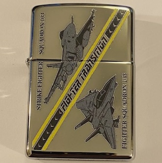 This is the chrome ZIPPO with both of the latest aircraft flown by the Jolly Rogers: the F-14 Tomcat (VF-103) and the F/A-18E Hornet (VFA-103)