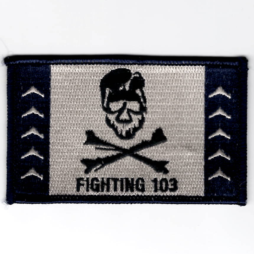 This is the dark-blue/gray version of the VF/VFA-103’s *FLAG* patch, worn on the left shoulder of the flight suit, and says “FIGHTING 103” along the bottom. This patch does not come with velcro attached.