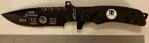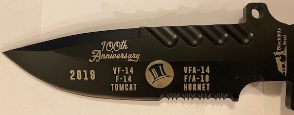 This is the VF/VFA-14 TOPHATTERS 100th Anniversary “BOOT-KNIFE” now available in VERY limited quantities!!! It has the squadron logo and info on the blade, comes with a metal “cloisonne” built into the handle, and has the black sheath and strap. Get them while they last!