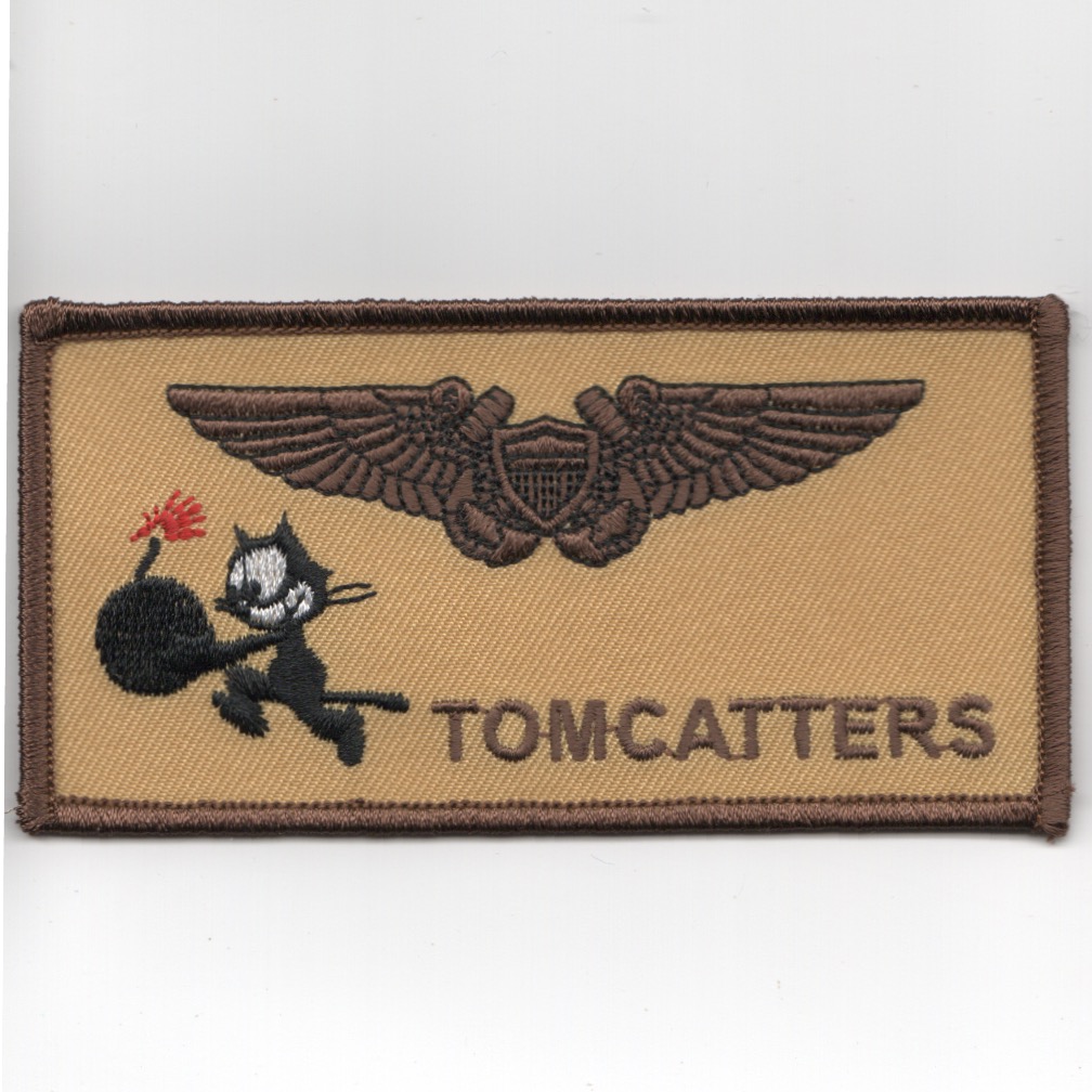 (Another AV8RSTUFF Creation): This is the desert nametag for VF/VFA-31 NFO/WSO’s that has their squadron name ‘TOMCATTERS’ embroidered on it. We used to have these “generic” nametags made so that when we were in port or at the club, it would mess with those that didn’t know us…..gave us some anonymity as well!! It has their log of ‘FELIX’ carrying a bomb (their logo) and does not come with velcro attached so that it can be embroidered. For a small fee, I can get them embroidered for you.