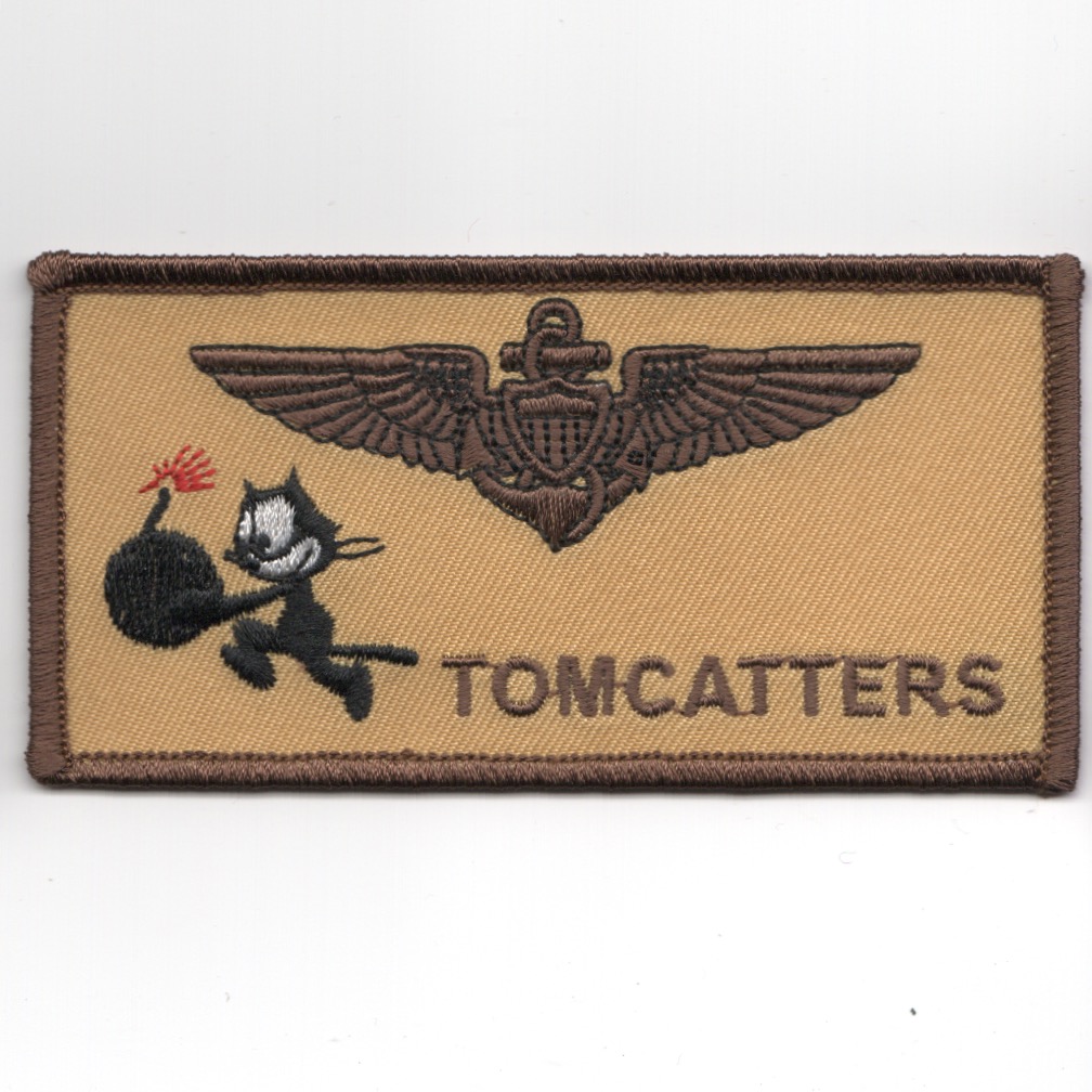 (Another AV8RSTUFF Creation): This is the desert nametag for VF/VFA-31 pilots that has their squadron name ‘TOMCATTERS’ embroidered on it. We used to have these “generic” nametags made so that when we were in port or at the club, it would mess with those that didn’t know us…..gave us some anonymity as well!! It has their log of ‘FELIX’ carrying a bomb (their logo) and does not come with velcro attached so that it can be embroidered. For a small fee, I can get them embroidered for you.