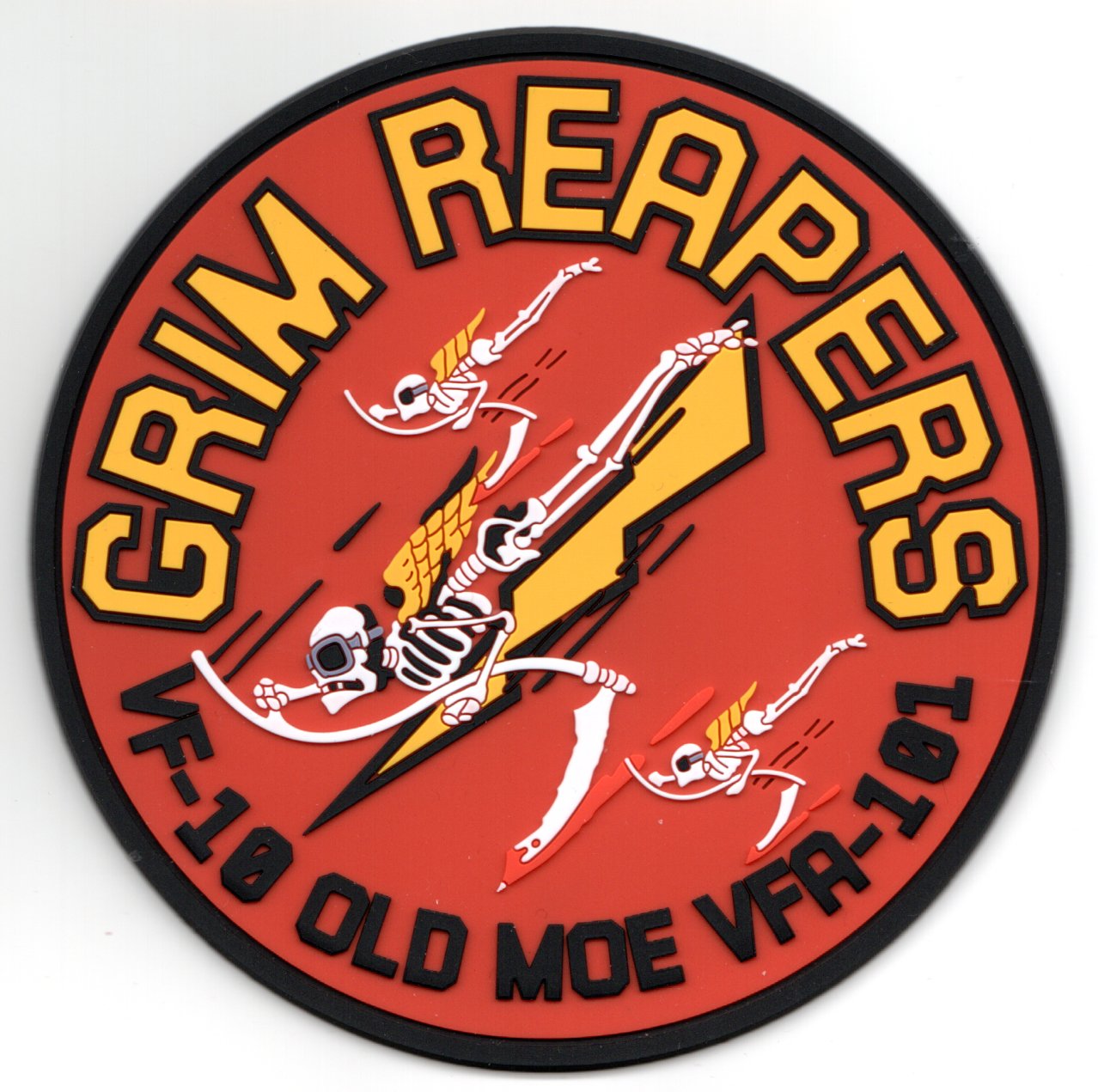 (From the Sqdn Supplier): Fighting Squadron 10 (VF-10), also known as the “Grim Reapers”, was an aviation unit of the US Navy, established on 3 June 1942 and disestablished on 26 November 1945. May 1952, VF-101 was reactivated for the Korean War, flying MULTIPLE aircraft, eventually becoming the Fleet Replacement Squadron for the F-14 Tomcat. With the decommissioning of the Tomcat, the squadron was again disestablished in 2005. With the purchase of the F-35 Lightning, VFA-101 was recommissioned for a brief period in 2012, but was again (and currently) disestablished as of 2019. This is a PVC (rubber) patch created commemorating that lineage, is nicely sized (5″ diamater), and does not come with velcro attached. There is a LOT of history online, so take a few moments to read their incredible story!!