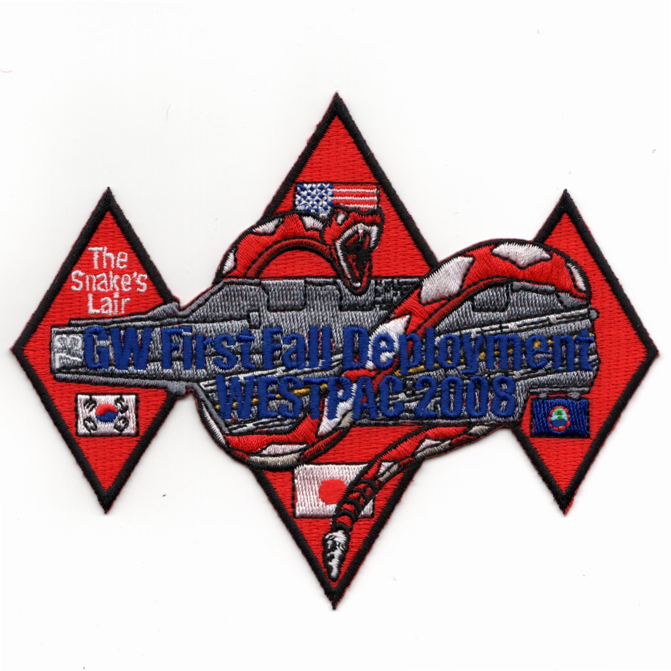 (From their Squadron Supplier): This is one of the 2008 cruise patches created for CVN-73 and VFA-102 that is from their “WESTPAC” Cruise. It shows the ‘Snake’ Mascot wrapped around the carrier and says “GW First Fall Deployment WESTPAC 2008”. This patch does not have velcro attached and my apologies for the cost, but to get original, authentic items from Japan costs me extra, but wanted to make sure we’re offering the best items.