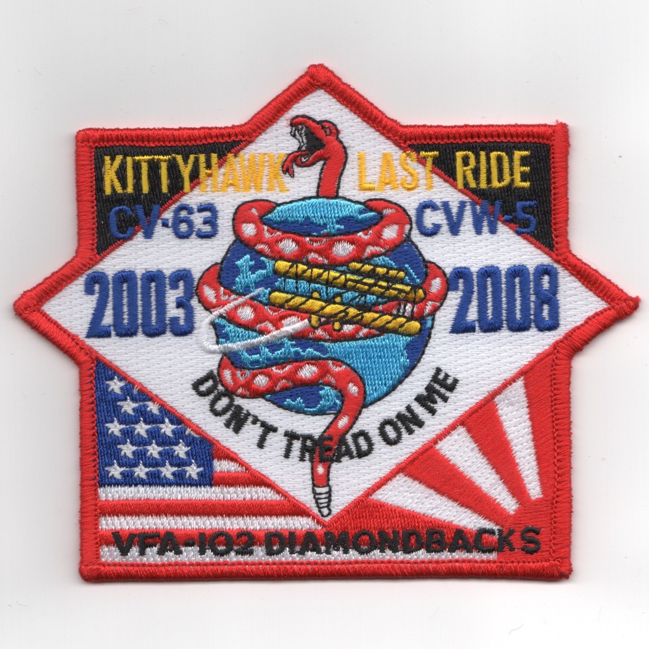 This is the 2010 cruise patch for CVN-73 and VFA-102 that is from their “”””East Asian”””” tour. It has the Korean Flag on the left (INVINCIBLE SPIRIT) and the Japanese Flag on the right (KEEN SWORD) with the VFA-102 ‘snake’ wrapping around the aircraft carrier. This patch does not have velcro attached.