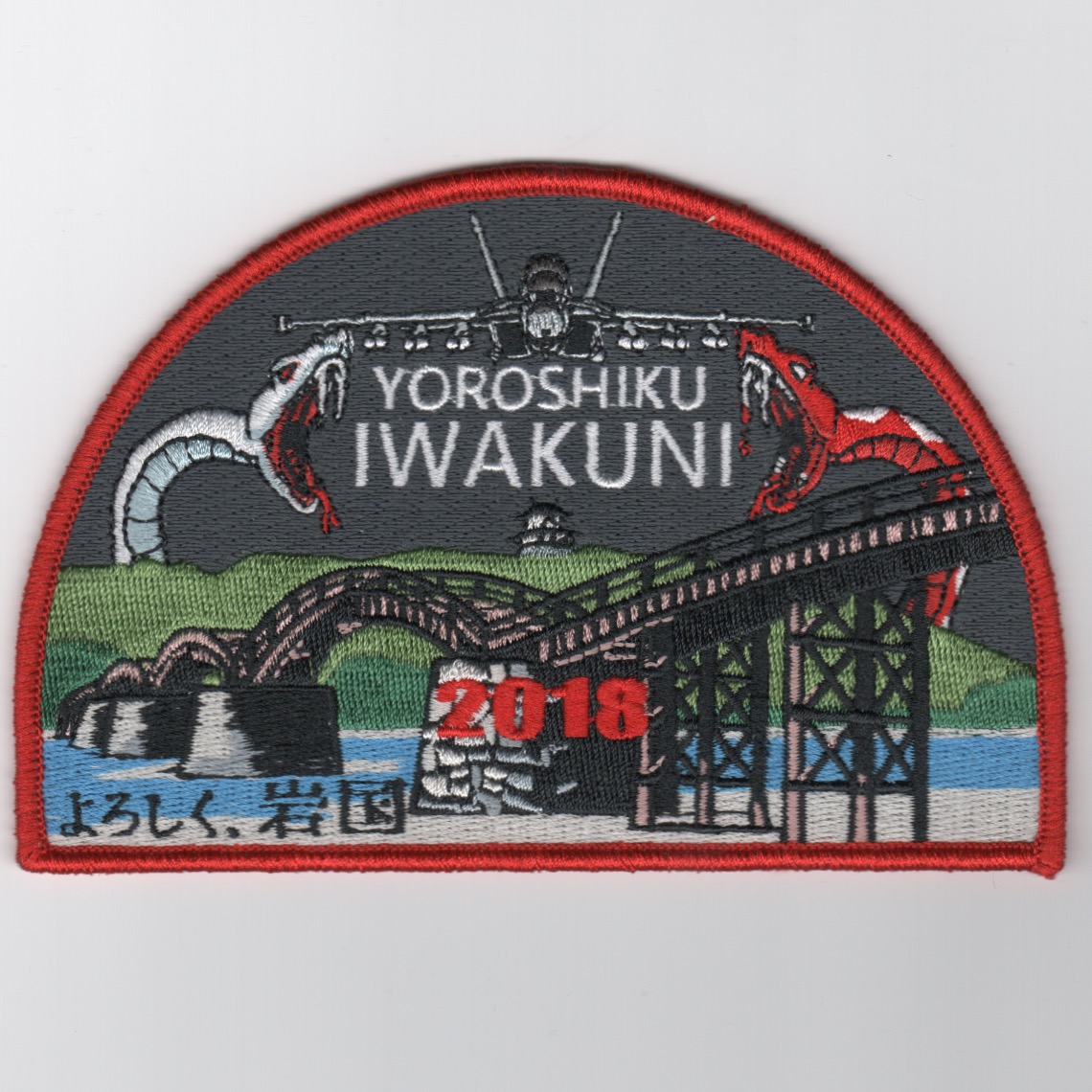 (From SQDN Supplier): This is the backpatch created for the VFA-102 Decommissioning that says ‘YOROSHIKU IWAKUNI’ with the date 2018 along the bottom. It depicts two of the snake mascots (one white, one red) on either side of the bridge. Received these last few originals from the actual squadron supplier. This patch does not have velcro on the back.