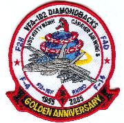 The VFA-102 “Diamondbacks” are located at NAS Lemoore, CA and fly the F/A-18 Hornet. They were established in July 1955, and transitioned from the F-4J Phantom to the F-14A Tomcat in July 1981 then to the F-18 Hornet in 2002. This is the round version of their 50th Anniversary patch.