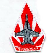 This is the (red/white) version of the Hornet diamond aircraft triangle. The VFA-102 “Diamondbacks” are located at NAS Lemoore, CA and fly the F/A-18 Hornet. They were established in July 1955, and transitioned from the F-4J Phantom to the F-14A Tomcat in July 1981 then to the F-18 Hornet in 2002 and this is the aircraft patch worn on the right sleeve of the flight suit. During operations against Libya in 1986, they were fired upon by SA-5 SAM Systems. They also participated in Operation Desert Storm. They currently are attached to CVW-1 onboard the USS John F. Kennedy.