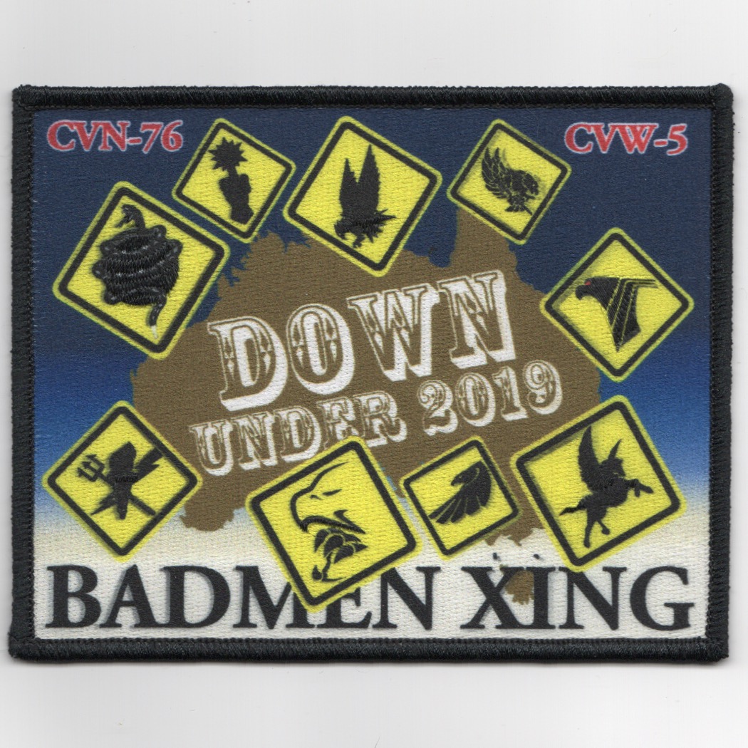 (From SQDN Supplier): This is the sublimated version of the 2019 ‘DOWN UNDER’ Pacific cruise for those squadrons attached to CVW-5 onboard USS Ronald Reagan (CVN-76). It shows all the squadron mascot logos on the yellow traffic warning signs. We only have a VERY FEW of these, please pardon me if they sell out before I can keep the site current…..no velcro on the back.