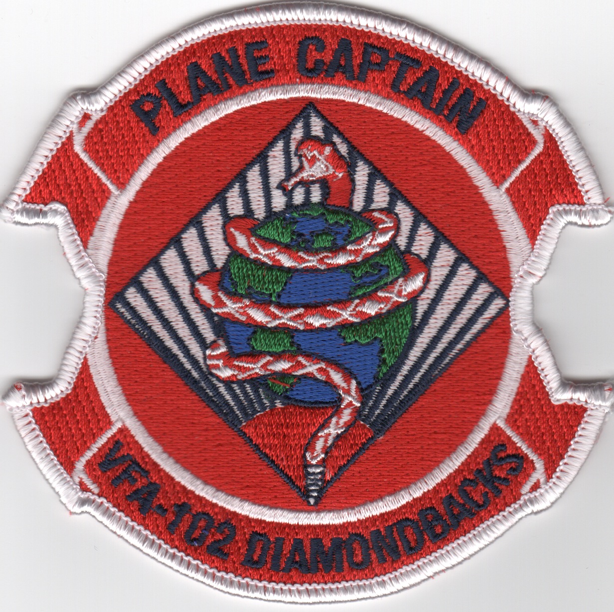 The VFA-102 “Diamondbacks” are located at NAS Lemoore, CA and fly the F/A-18 Hornet. They were established in July 1955, and transitioned from the F-4J Phantom to the F-14A Tomcat in July 1981 then to the F-18 Hornet in 2002. During operations against Libya in 1986, they were fired upon by SA-5 SAM Systems. They also participated in Operation Desert Storm. This is the “Plane Captain” patch worn by those who take care of the aircraft.