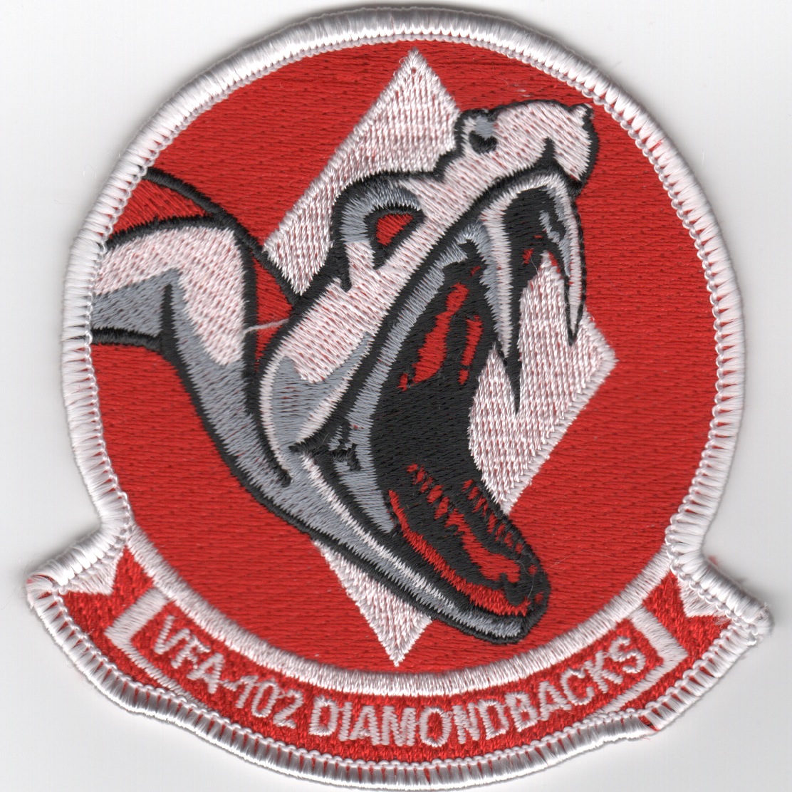 The VFA-102 “Diamondbacks” are located at NAS Lemoore, CA and fly the F/A-18 Hornet. They were established in July 1955, and transitioned from the F-4J Phantom to the F-14A Tomcat in July 1981 then to the F-18 Hornet in 2002. During operations against Libya in 1986, they were fired upon by SA-5 SAM Systems. They also participated in Operation Desert Storm. This is the “Snake Head” version of their red “Friday” patch and does not come with velcro attached.