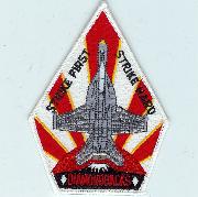 This is the “Strike First, Strike Hard” version of the Hornet diamond aircraft triangle. The VFA-102 “Diamondbacks” are located at NAS Lemoore, CA and fly the F/A-18 Hornet. They were established in July 1955, and transitioned from the F-4J Phantom to the F-14A Tomcat in July 1981 then to the F-18 Hornet in 2002 and this is the aircraft patch worn on the right sleeve of the flight suit. During operations against Libya in 1986, they were fired upon by SA-5 SAM Systems. They also participated in Operation Desert Storm. They currently are attached to CVW-1 onboard the USS John F. Kennedy.