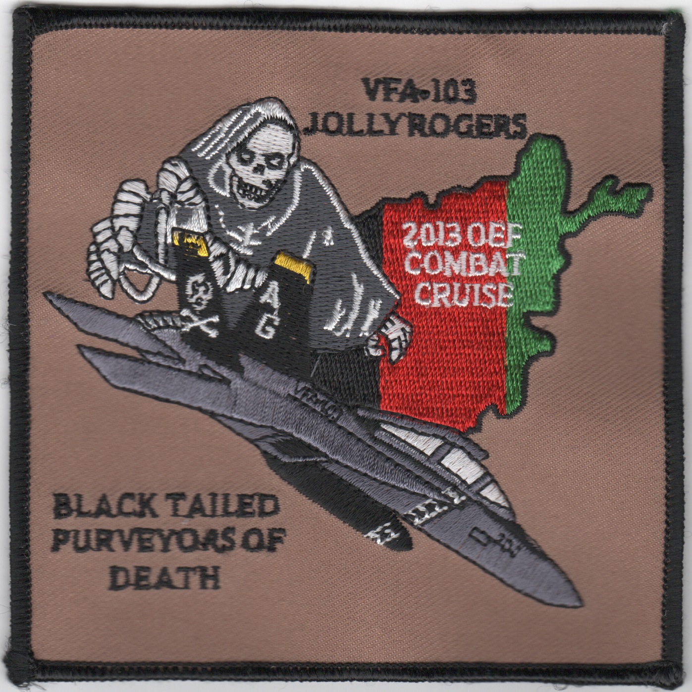 This is VFA-103’s cruise patch for their 2013 Operation Enduring Freedom (OEF) cruise. It says “”””Black Tailed Purveyors of Death”””” and shows the F/A-18 Hornet over Afghanistan. This patch does not come with velcro attached.