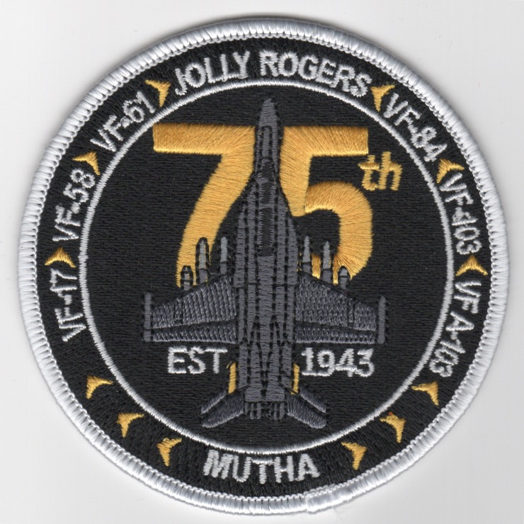 (Obtained from the squadron): This is VFA-103’s commemorative patch celebrating the 75th anniversary of the famous Jolly Rogers squadron, listing all the aircraft flown during their squadron history. This patch does not come with velcro attached.