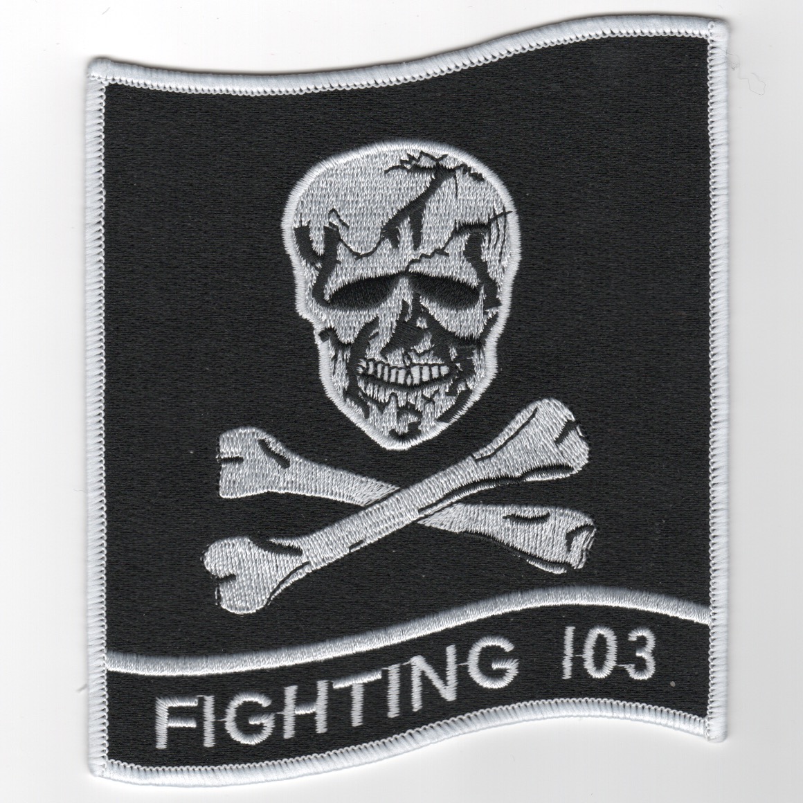 VFA-103 was established in May 1952 and began the transition from F-4S Phantoms to the F-14A Tomcat to the F/A-18F SuperHornet in 2005. The ‘Sluggers’ were with the USS Saratoga in CVW-17 for the majority of her time, before switching to the USS Enterprise. VF-103 adopted the “Skull and Crossbones” of VF-84 to continue their tradition. VF-103 had one of their TARPS-birds shot down by an optical SA-2 derivative in Desert Storm with the pilot being rescued and the RIO becoming a POW. This is the current version of their squadron “backpatch” and does not have velcro attached.