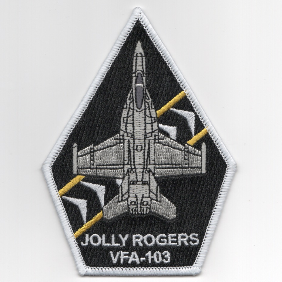 (Obtained from the squadron): VFA-103 was established in May 1952 and began the transition from F-4S Phantoms to the F-14A Tomcat to the F/A-18F SuperHornet in 2005. The ‘Sluggers’ were with the USS Saratoga in CVW-17 for the majority of her time, before switching to the USS Enterprise. VF-103 adopted the “Skull and Crossbones” of VF-84 to continue their tradition. VF-103 had one of their TARPS-birds shot down by an optical SA-2 derivative in Desert Storm with the pilot being rescued and the RIO becoming a POW. This is the current version of their new F/A-18 aircraft “diamond” patch and does not come with velcro attached.
