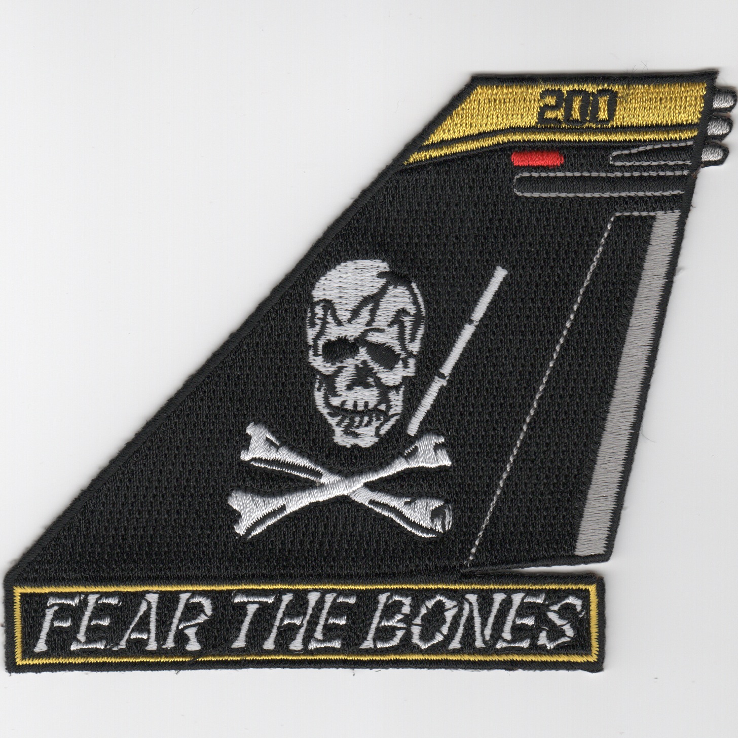 VFA-103’s “family line” was established in May 1952 and began the transition from F-4S Phantoms to the F-14A Tomcat in January 1983, then to the F/A-18F in Dec 2004. This is F/A-18 “TAIL FIN” patch they created, and it says “FEAR THE BONES”. This patch does not come with velcro attached.