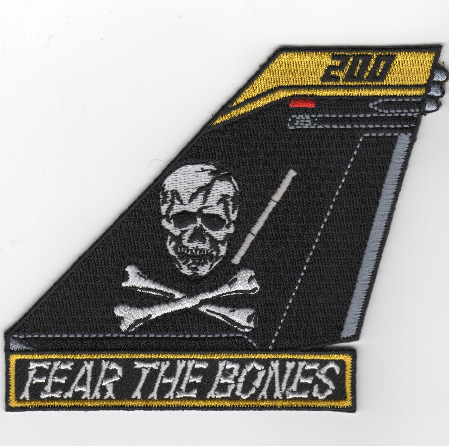VFA-103 “family line” was established in May 1952 and began the transition from F-4S Phantoms to the F-14A Tomcat in January 1983, then to the F/A-18F in Dec 2004. This is one of their “TAIL FIN” patches they created, and it says “FEAR THE BONES”. This patch does not come with velcro attached.