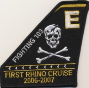 VFA-103 “family line” was established in May 1952 and began the transition from F-4S Phantoms to the F-14A Tomcat in January 1983, then to the F/A-18F in Dec 2004. This is the first cruise patch they issued. It says “First Rhino Cruise 2006-2007”. This patch does not come with velcro attached.