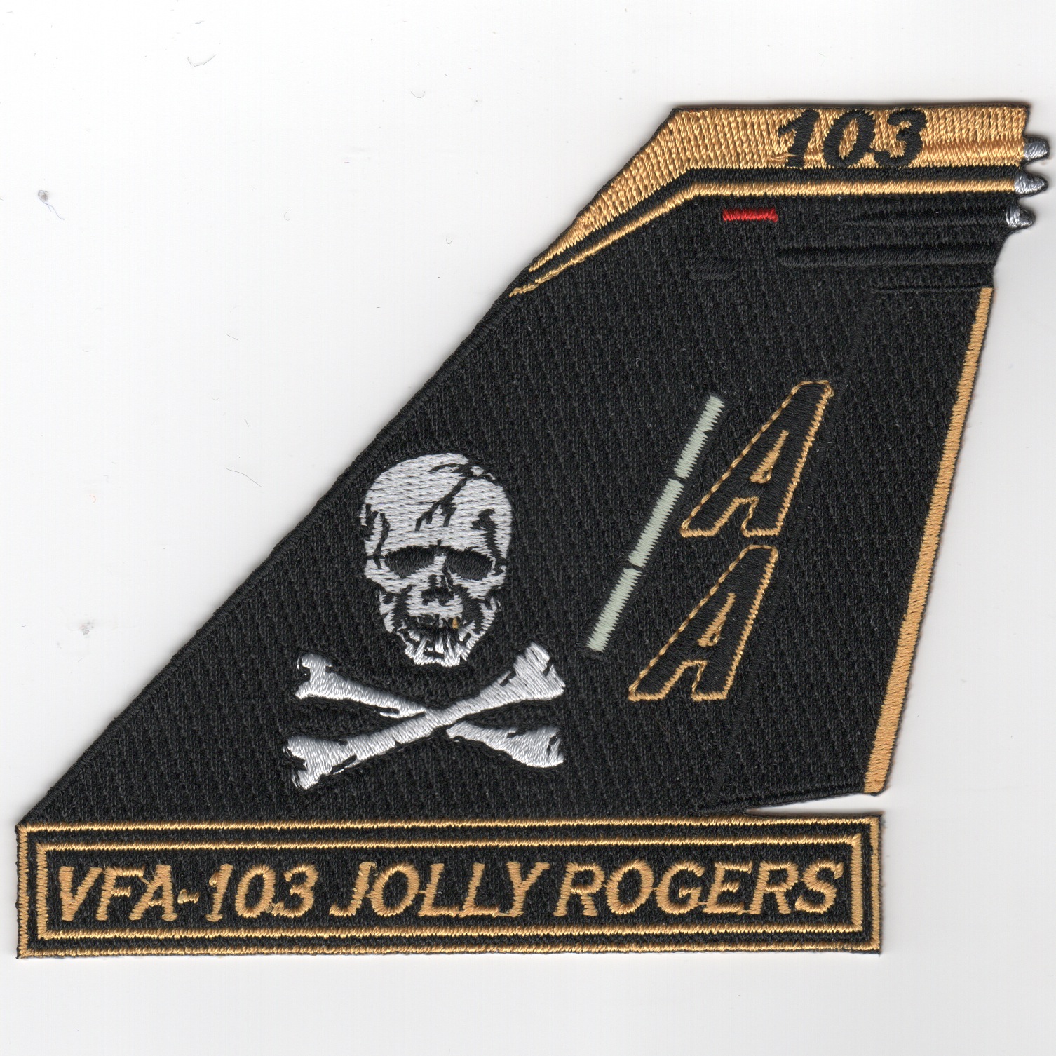 VFA-103 “family line” was established in May 1952 and began the transition from F-4S Phantoms to the F-14A Tomcat in January 1983, then to the F/A-18F in Dec 2004. This is one of their “TAIL FIN” patches they created, and it says “JOLLY ROGERS”. This patch does not come with velcro attached.