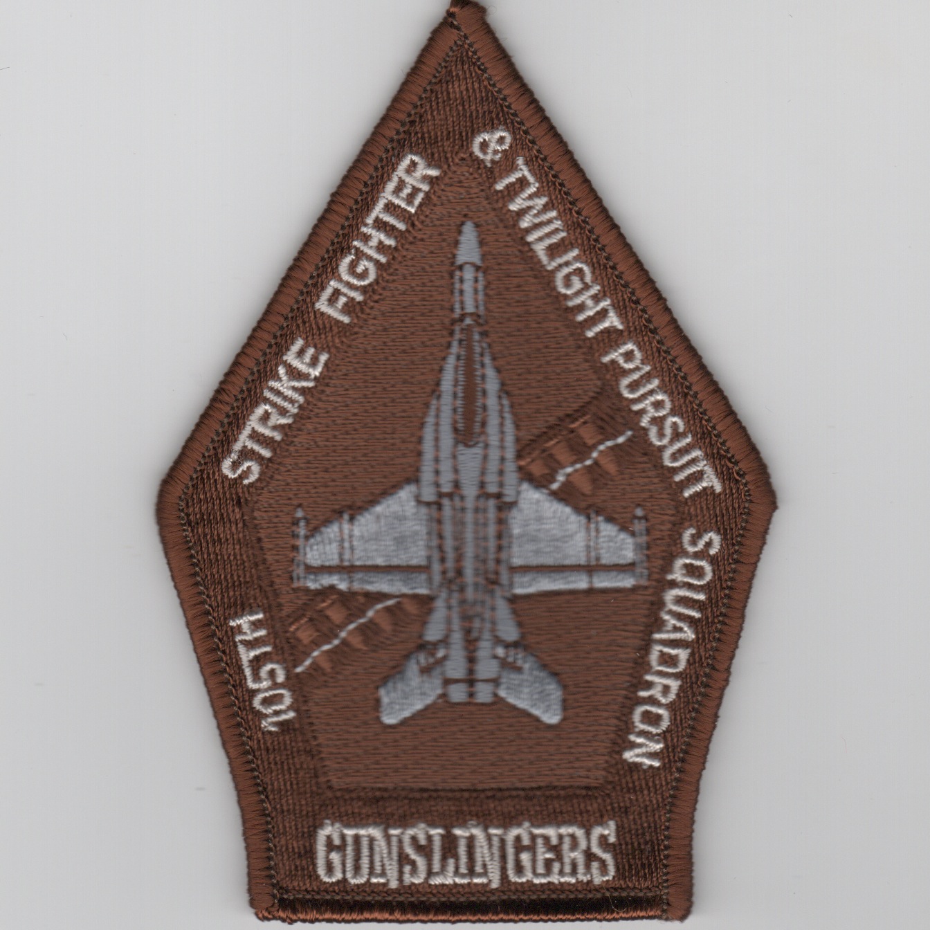 This is the desert version of the aircraft ‘coffin’ patch for VFA-105. It says “STRIKE FIGHTER & TWILIGHT PURSUIT” along the top, “GUNSLINGERS” along bottom and shows the planform of the aircraft.