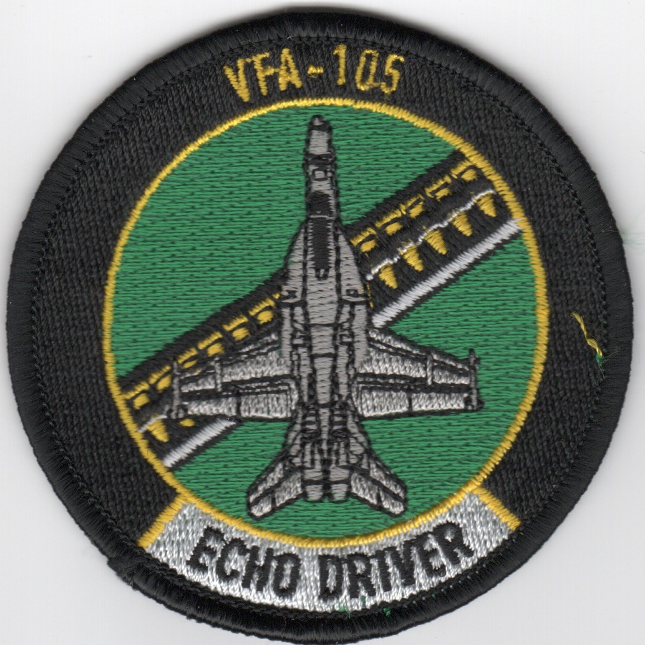 Strike Fighter Squadron 105 (VFA-105), also known as the “Gunslingers”, is a US Navy strike fighter squadron based at NAS Oceana, Virginia. The “Gunslingers” are an operational fleet squadron and fly the F/A-18E Super Hornet. Their radio callsign is “Canyon” and the tail code is AC. This is the aircraft ‘bullet’ patch for VFA-105. It says “Echo Driver” along bottom, refering to the model of F/A-18(E) they fly and does not come with velcro attached.
