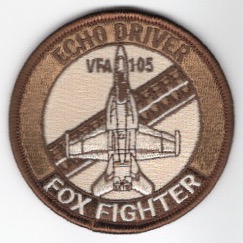 Strike Fighter Squadron 105 (VFA-105), also known as the “Gunslingers”, is a US Navy strike fighter squadron based at NAS Oceana, Virginia. The “Gunslingers” are an operational fleet squadron and fly the F/A-18E Super Hornet. Their radio callsign is “Canyon” and the tail code is AC. This is the desert version of the aircraft ‘bullet’ patch for VFA-105. It says “Echo Driver” (top), “Fox Fighter” (bottom) referring to the model of F/A-18(E) they fly and does not come with velcro attached.