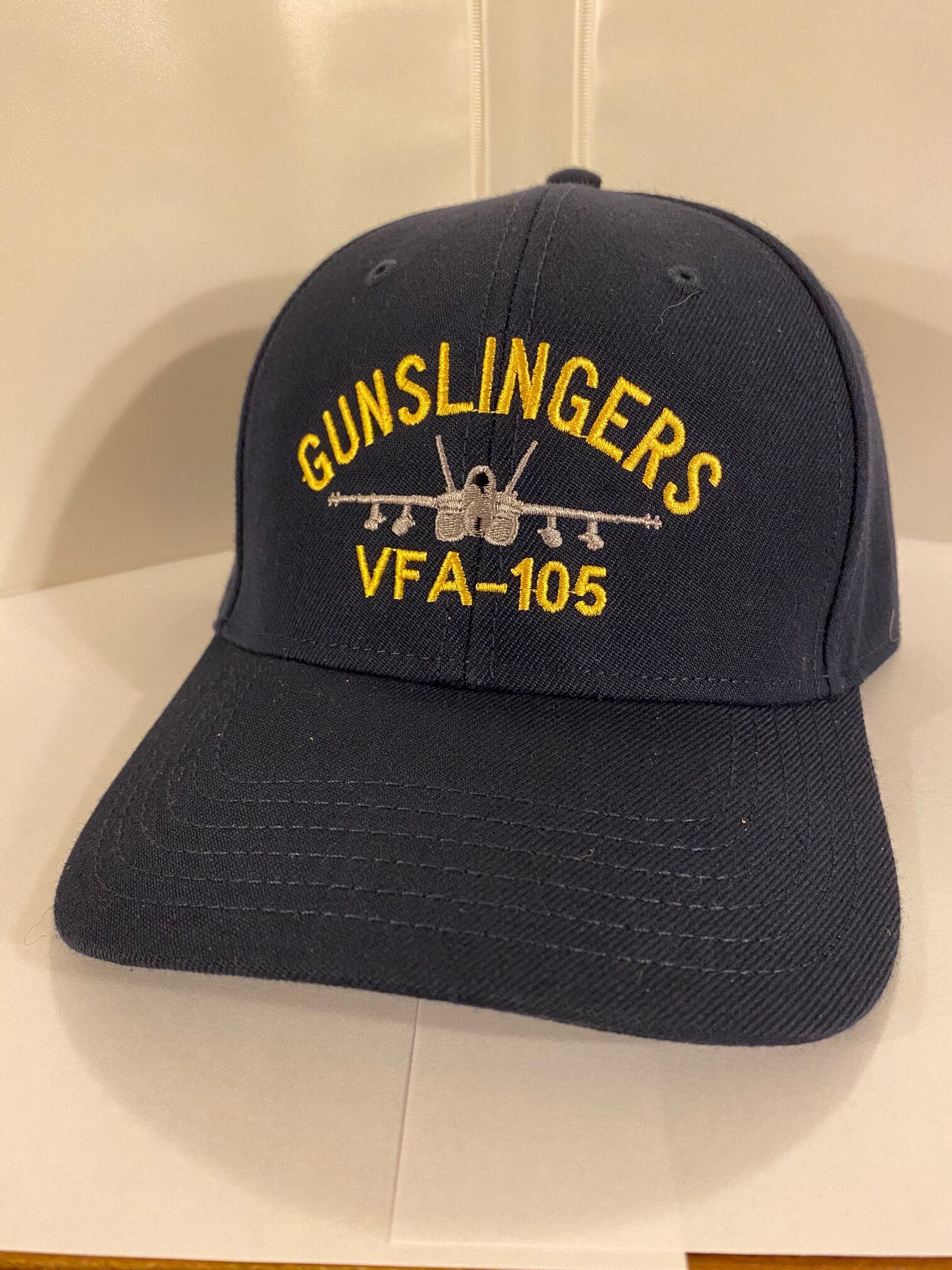 This is the ballcap for VFA-105 with the frontal view of the F/A-18 Hornet directly embroidered onto a dark blue ballcap.
