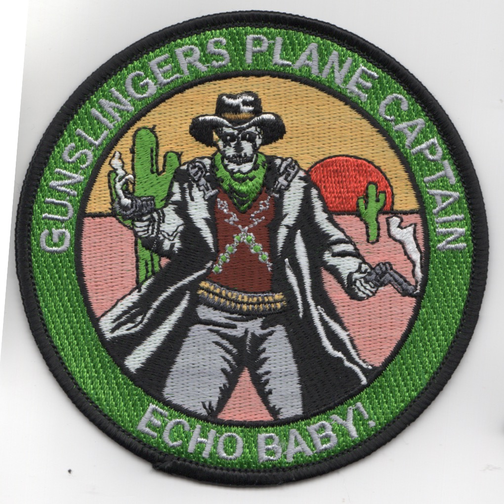 This is the 4-inch version of the Plane Captain patch created for the hardest working men/women in the US Navy….the Plane Captains. This patch shows the ‘Gunslinger Skeleton’ in the desert with his smoking guns and says “”””ECHO BABY”””” at the bottom. This patch does not come with velcro.
