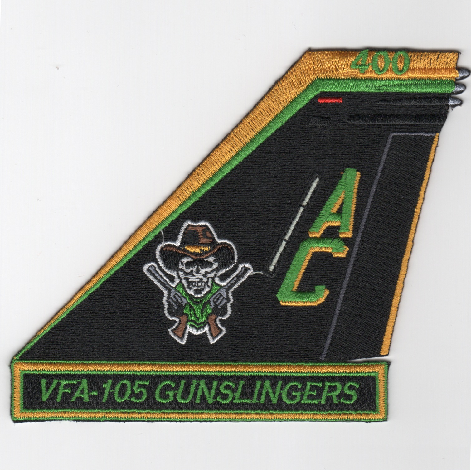 The “Gunslingers” of VFA-105 are based at NAS Oceana, VA. They were established in March 1968, and are now flying the McDonnell Douglas F/A-18C Hornet. They participated in the Gulf War aboard the USS J.F. Kennedy (CV-67) as part of CVW-3. This is their version of their TAILFIN patch and does not come with velcro attached.