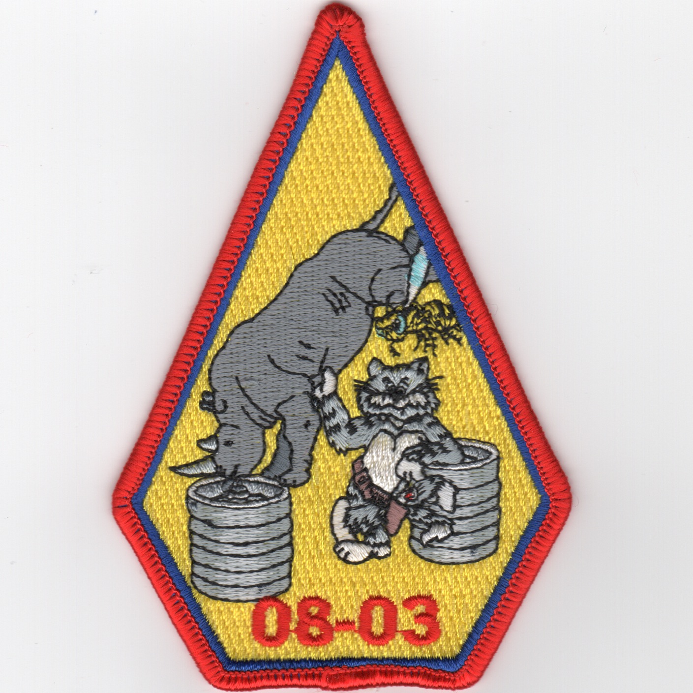 VFA-106 began operating on 27 April 1984 as the East Coast FRS (“RAG”) for the F/A-18A/B/C/D models at NAS Cecil Field, FL. They are now located at the Master Jet Base at NAS Oceana, VA where they train Navy, Marine, and foreign exchange pilots. This is the class patch for Class 08-03. This patch shows “Felix” holding a “Rhino” upside down on a beer keg. This patch does not come with velcro attached.