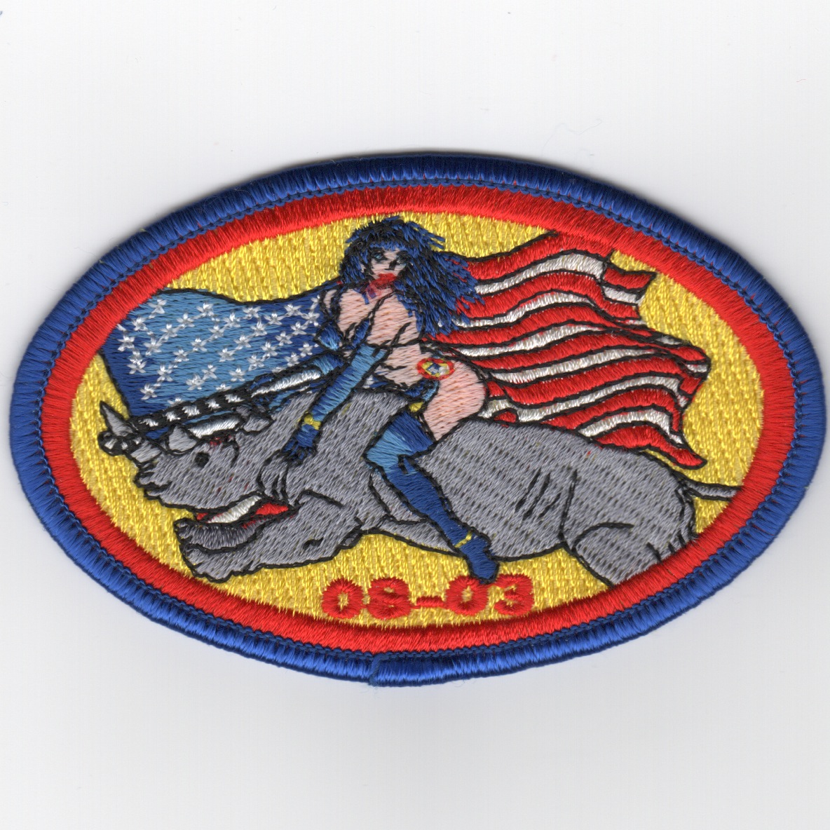 VFA-106 began operating on 27 April 1984 as the East Coast FRS (“RAG”) for the F/A-18A/B/C/D models at NAS Cecil Field, FL. They are now located at the Master Jet Base at NAS Oceana, VA where they train Navy, Marine, and foreign exchange pilots. This is the class patch for Class 08-03. This patch shows a “hot babe” (Wonder Woman?) riding atop a “Rhino” (F/A-18 Hornet). This patch does not come with velcro attached.