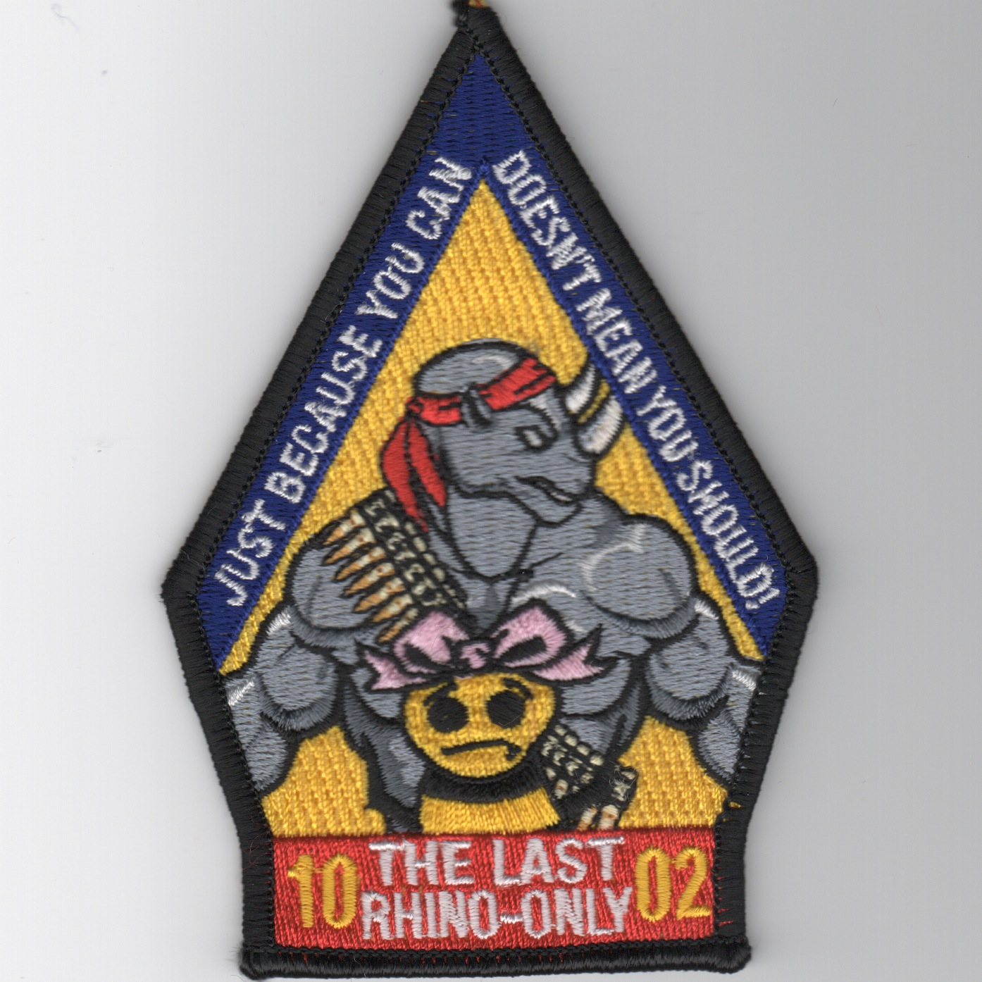 VFA-106 began operating on 27 April 1984 as the East Coast FRS (“RAG”) for the F/A-18A/B/C/D models at NAS Cecil Field, FL. They are now located at the Master Jet Base at NAS Oceana, VA where they train Navy, Marine, and foreign exchange pilots. This is the class patch for Class 10-02. This patch shows one of the Teenage Mutant Ninja Turtle with “Rhino” horns. This patch does not come with velcro attached.