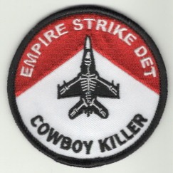 VFA-106 began operating on 27 April 1984 as the East Coast FRS (“RAG”) for the F/A-18A/B/C/D models at NAS Cecil Field, FL. They are now located at the Master Jet Base at NAS Oceana, VA where they train Navy, Marine, and foreign exchange pilots. This is the “EMPIRE STRIKE DET / COWBOY KILLER” aircraft shoulder patch for operations at El Centro, CA and does not come with velcro attached.