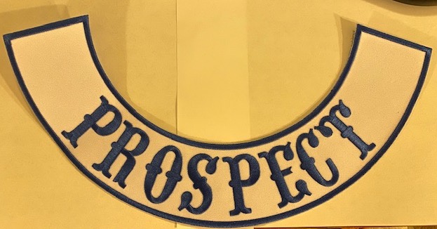 (Note the Vest backpatches above). This is the VFA-106 ‘PROSPECT’ rocker patch worn on the lower left side of the leather vest signifying someone as a “prospect” for the squadron…..I imagine the new-guy gets to wear it around the squadron! These DO NOT have velcro, they are designed to be sewn on.