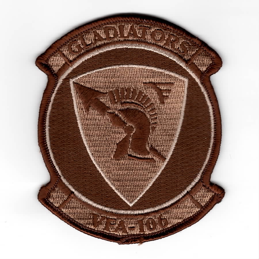 The “Gladiators” of VFA-106 were established in April 1984 as the East Coast RAG for the F/A-18 Hornet. They operate the A/B/C/D models of this aircraft and fly from NAS Cecil Field, FL. They are located at NAS Oceana, VA. They also fly the T-34C Mentor as range-clearance aircraft. This is the medium-sized version of their desert squadron patch and does not come with velcro attached.