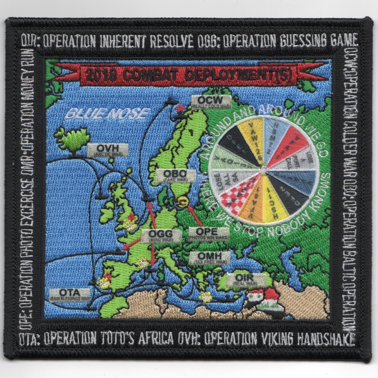 (Another AV8RSTUFF Creation): This is one of the 2018 Cruise patches for VFA-11 for their support during the 2018 deployment in Operation INHERENT RESOLVE (OIR). This has the “WHEEL OF SQUADRONS” (sublimated for incredible detail) and says “ROUND AND ROUND WE GO, WHERE WE STOP NOBODY KNOWS” with the Mediterranean port call locations. This patch does not have velcro attached.
