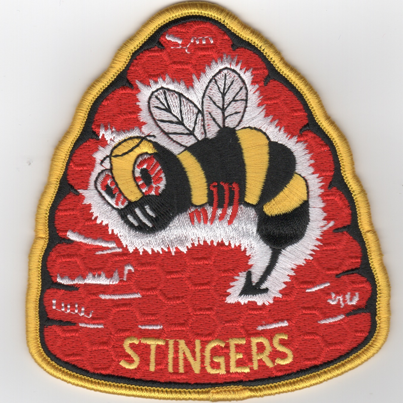 The “Stingers” were originally designated VF-113 in July 1948, then became VA-113 in March 1956, before final designation of VFA-113 on 25 March 1983. Flying A-7s for many years, VFA-113 recieved F/A-18Cs in October 1991. This is the “Beehive” patch created for them with the yellow border and red background.