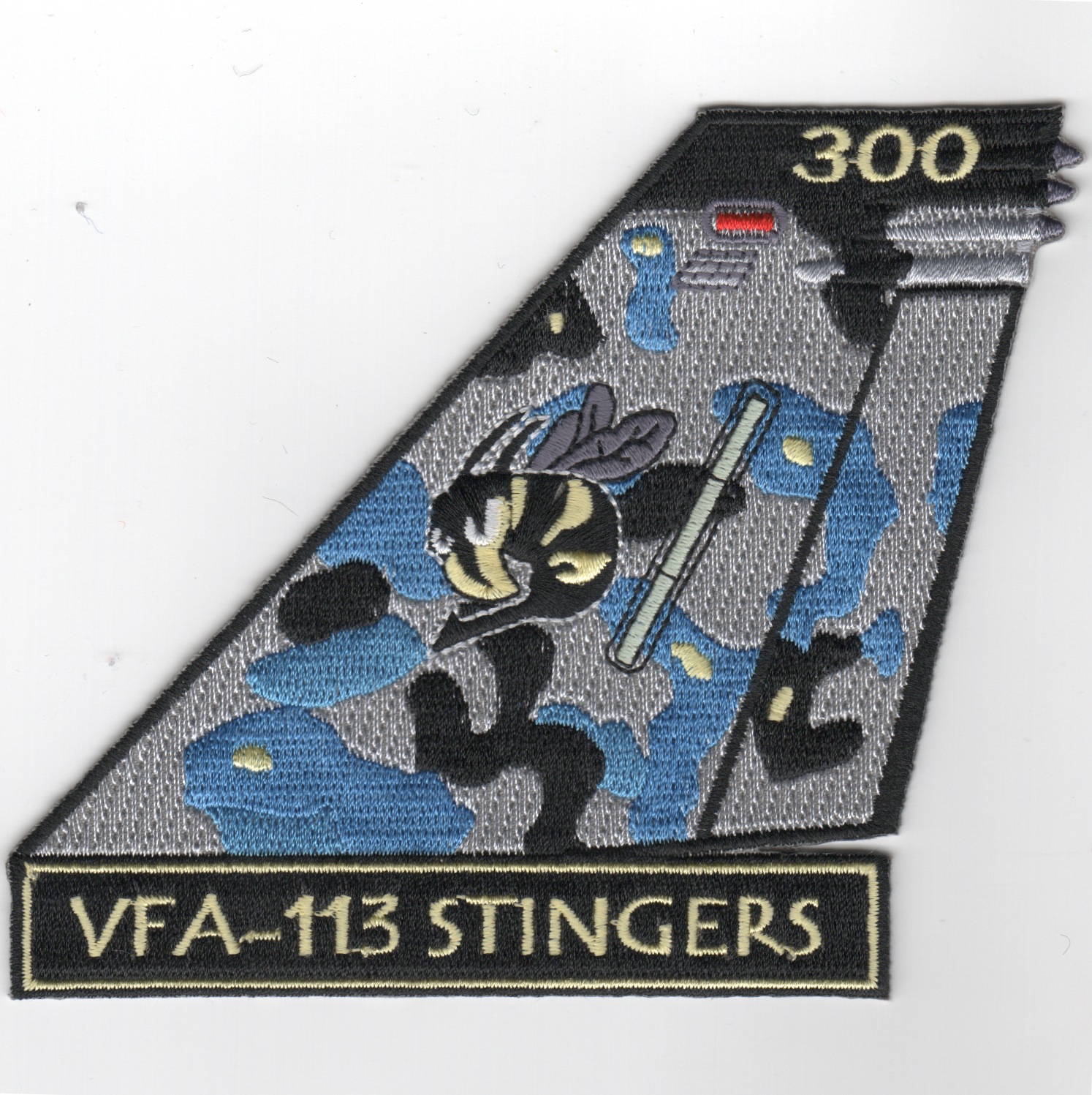 The “Stingers” were originally designated VF-113 in July 1948, then became VA-113 in March 1956, before final designation of VFA-113 on 25 March 1983. Flying A-7s for many years, VFA-113 recieved F/A-18Cs in October 1991. They were onboard the USS Car Vinson (CVN-70) and attached to CVW-14. This is the “BLUE CAMO” version of their TAILFIN patch and does not come with velcro attached.