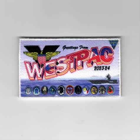 (Another AV8RSTUFF Creation): This is the 2024 cruise patch created by VAW-113 for Carrier Air Wing TWO (CVW-2) onboard the USS Carl Vinson (CVN-70). This patch was created for all of the Air Wing squadrons, to include VFA-2 / VFA-97 / VFA-113 / VFA-192 / VAQ-136 / VAW-113. This is the “small” version, is a very detailed patch, says “GREETINGS FROM WESTPAC / 2023-24”, and DOES come with velcro attached.