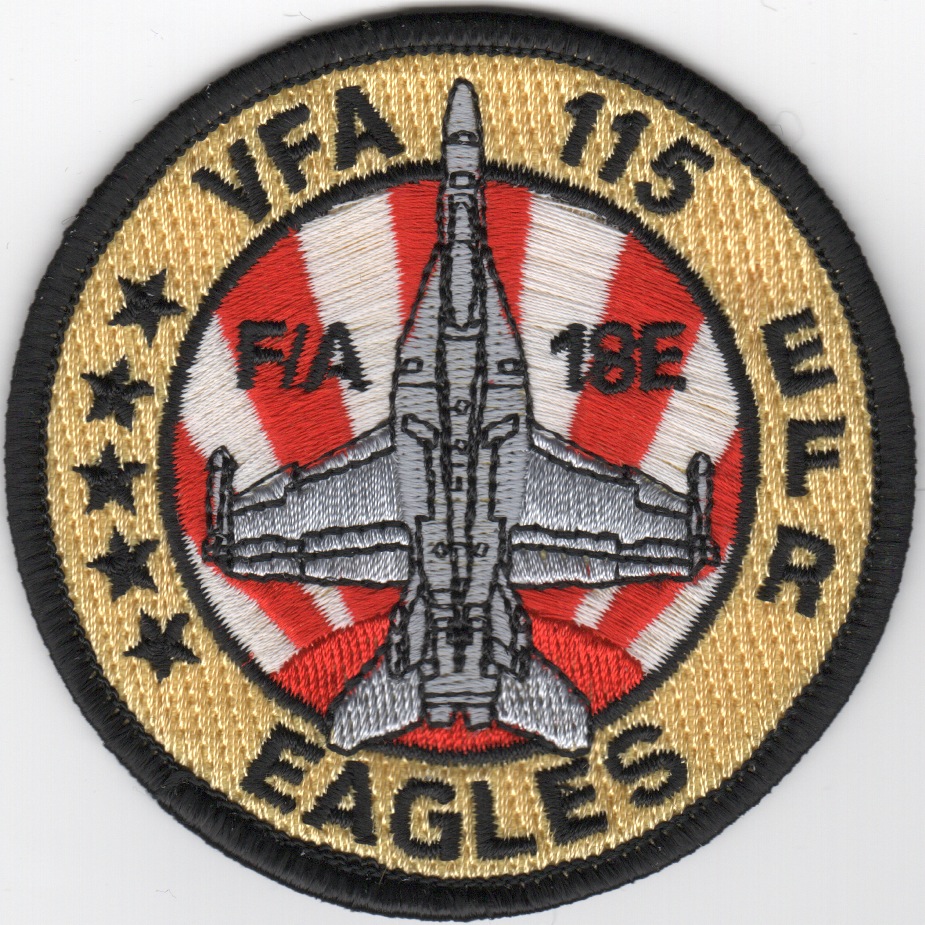 The ‘Eagles’ have a long history, beginning as Torpedo Squadron 11 in October 1942. They became VA-115 in July 1948, and for many years were nicknamed the “Arabs” until changed for obvious reasons. They also gave up their Intruders based out of NAS Whidbey Island in the early ’90s and transitioned to the F/A-18C Hornet flying out of NAS Lemoore, CA. This is the “red/white-sunrays” version of their aircraft ‘bullet’ with FIVE STARS (left side) that is worn on the left flightsuit sleeve and does not come with velcro attached.