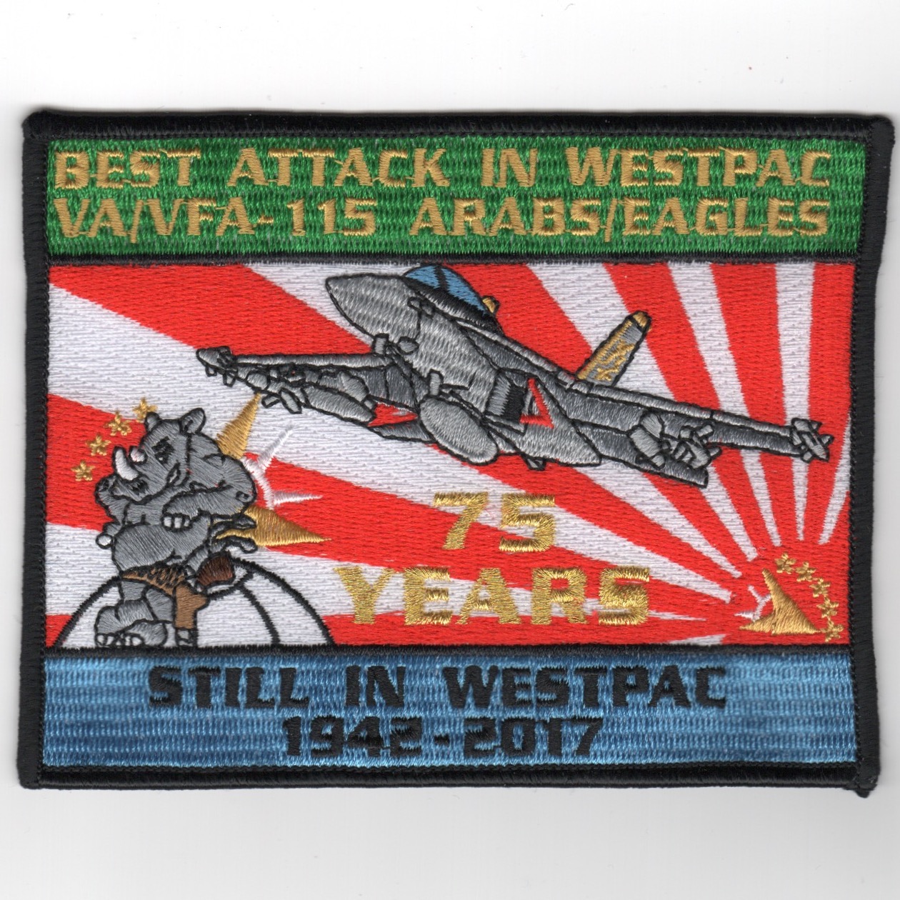 (Karean Supplier) This is the ’75th Anniversary’ patch created by the VFA-115 ‘Eagles” for their time in the Western Pacific Theater (WESTPAC). Strike Fighter Squadron 115 (VFA-115) is known as the “Eagles”, callsign “Talon”, a USN F/A-18E Super Hornet Strike/Fighter squadron stationed at MCAS Iwakuni. Their tail code is ‘NF’ and were established as Torpedo Squadron VT-11 on 10 October 1942, redesignated VA-12A on 15 November 1946, VA-115 on 15 July 1948, then finally VFA-115 which is their current assignment. This patch says “BEST ATTACK IN WESTPAC” (their motto) and “VA/VFA-115 ARABS/EAGLES” (top), ’75 YEARS’ (gold thread – middle), and “STILL IN WESTPAC 1942 – 2017″ (bottom). Only received a few of these from a small Korean embroidery shop while a friend was on a visit there earlier this month. This patch does not have velcro attached!”
