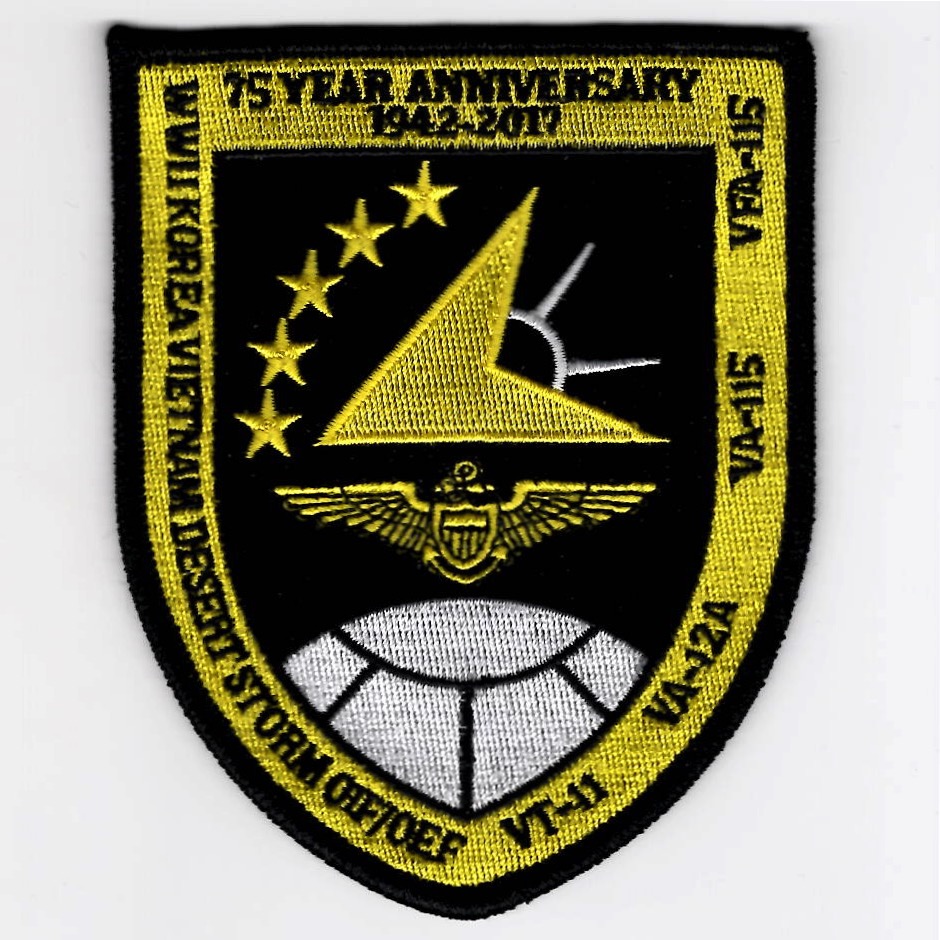 This patch celebrates the *75-YEAR* anniversary of VA/VFA-115 and lists all the conflicts the squadron has been involved in, from WWII to OIF/OEF (left) and the Squadron Designators it flew under (right). This patch does not come with velcro attached and is in very limited supply.